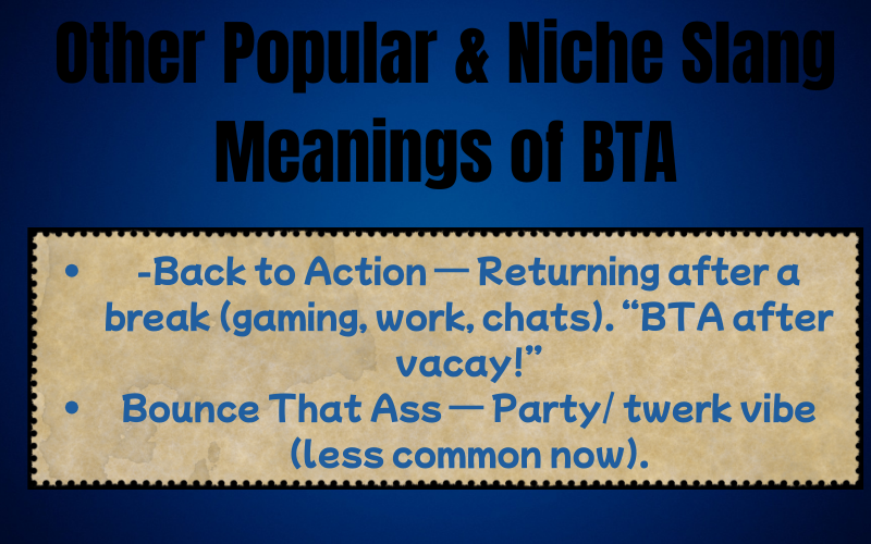 BTA is a perfect example of how slang evolves super fast in the digital age—from tough street talk to viral sports memes to everyday compliments. Next time you see BTA in a comment or caption, check the vibe: hype praise? Victory roast? Or just “I’m back”? Now you’re fully in the know! 😏
