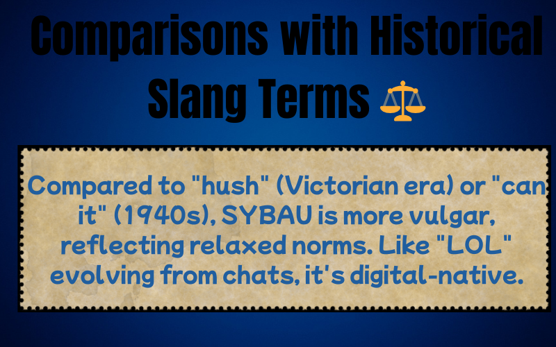 Compared to “hush” (Victorian era) or “can it” (1940s), SYBAU is more vulgar, reflecting relaxed norms. Like “LOL” evolving from chats, it’s digital-native.