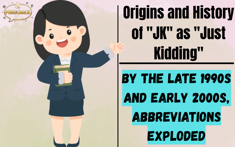 By the late 1990s and early 2000s, abbreviations exploded. Urban Dictionary’s first entry for “JK” as “just kidding” dates to 2001, but it likely appeared earlier in informal chats.